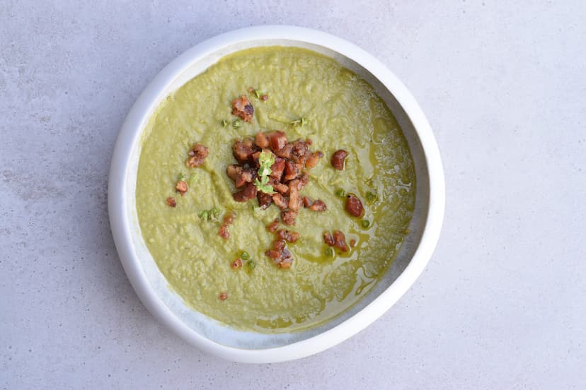 Start by cleaning the peas, and boil them in hot water until they are tender. Clean and slice the shallot into small slices, in a large pot add two spoons of olive oil and the sliced shallots, heat it for a bit, always stirring to prevent the shallots from burning. At this point add the boiled peas, stir it and then add the water, heat it till the boiling point, then lower the heat and cook it for at least 15 minutes. Add salt and pepper. Now transfer the whole in the mixer or use a hand blender to turn the peas into a smooth and silk-like cream. Now cut the guanciale into thin slices, heat a frying pan and then throw the guanciale slices and cook it until golden and crispy.